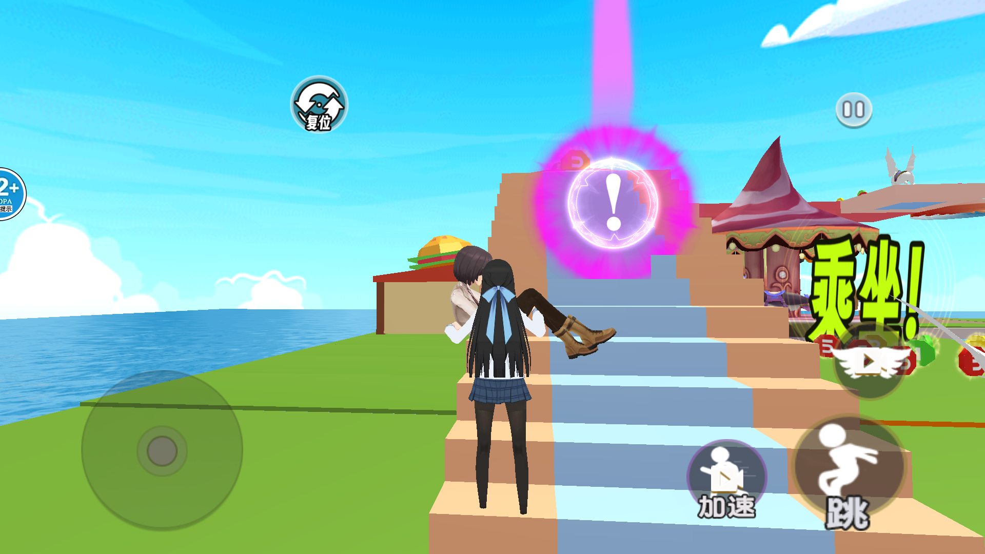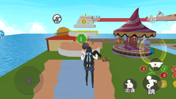 3.如下图所示,玩家需要朝着赛道跳跃跑酷前进,要注意把握好平台之间的间隙,避免坠落。
