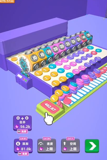 2、通过添加、合并轮子等操作升级设备,提升生产速度与产量,同时关注交易中心动态,合理分配硬币换取金钱。