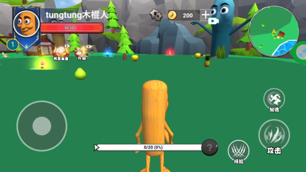 2、左侧轮盘来控制木头人移动,在场景中击打各样的食物来获取经验进行升级。