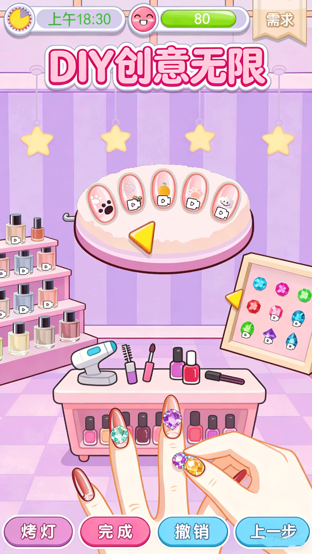 2、还原真实美甲工具的使用逻辑,操作简洁易上手,通过模拟涂抹、粘贴与固化等动作,带来逼真的创作体验。