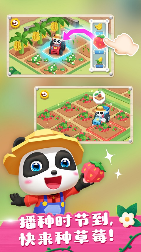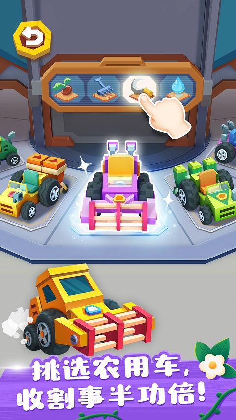 玩家可以坐上耕地农用车,开始开垦耕地。驾驶农用车,翻松土地、刨去杂草和石块,土地焕然一新,可以开始耕种了。宝宝们可以挑选种子、用播种车撒种,再更换洒水车,给种子浇浇水,一起观察它们的成长过程。