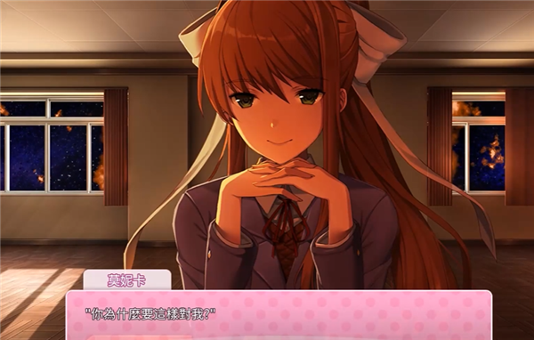 删除文件后重新启动游戏,会触发莫妮卡的崩溃剧情:她在屏幕上逐渐消散,留下告别话语。
