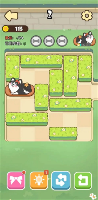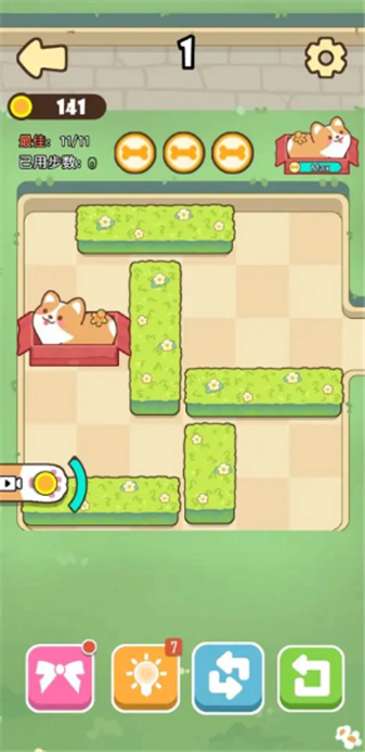 这是一个类似华容道的解谜游戏!你的小狗被困在了花园之中,尝试移动场上的花丛,让你的小狗从花园中被拯救出来吧!