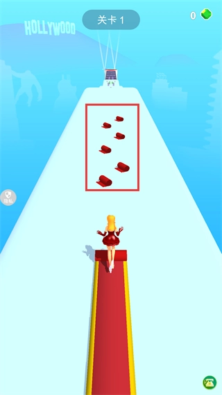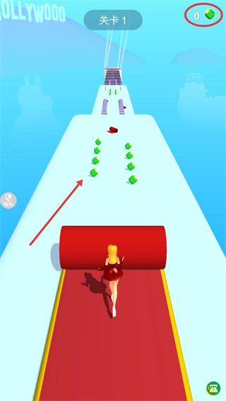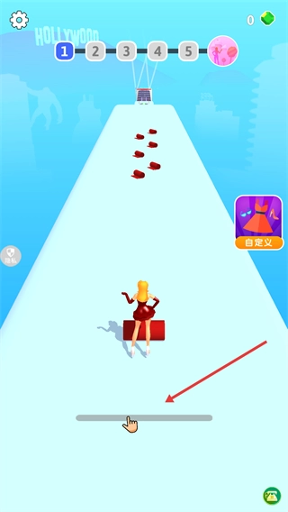 1、在【红毯女王】关卡界面,通过滑动底部操作条来操控角色移动,收集路径上的红毯片段以拓展红毯长度。