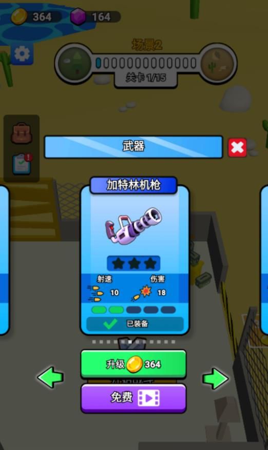 2、利用战斗获得的资源升级枪械参数,如提升加特林的射速与伤害,或增强自身生命与移动速度。