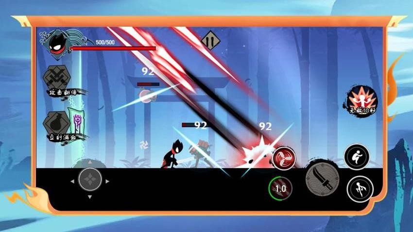 1、屏幕左侧轮盘控制火柴人移动,右侧控制跳跃以及攻击技能释放。