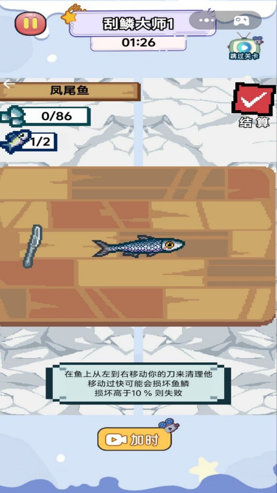 2、小心翼翼地为鱼刮鳞,避免伤到鱼肉,赚取丰厚奖励不断激励自己。