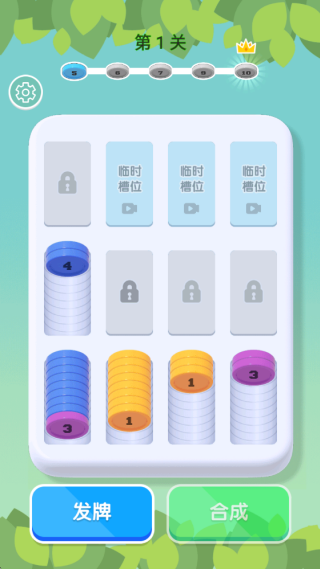1、进入悠闲,点击发牌,相同颜色的金币进行合成,成功的消除,完成之后点击合成。