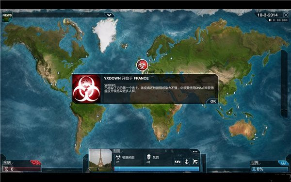 每一局游戏大约在十到三十分钟可以结束,而玩家可以选择第一个开始感染的国家,不同的国家也会有不同能够抵抗的病毒,然后就会在世界地图上看到因为你执行的策略,而让病毒在地图上逐渐扩散的路线与范围,而我们的目标就是让全世界都被感染,并且灭绝所有感染的人类。