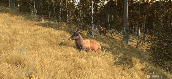 2、动态生态系统:游戏中的15种野生动物(如红鹿、岩羚羊、棕熊、金豺等)具有独立的行为逻辑,会根据昼夜和季节进行觅食、饮水和迁徙。每一次狩猎都会对生态系统产生长远影响。