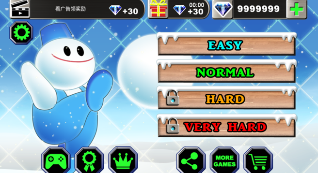 4、然后选择难度,选择完难度后,我们可以看到有两个选项,一个是直接开始,一个是花费50钻石,充满能量的开始。能量模式下,雪人兄弟会获得加强的雪蛋攻击和更快的移动速度。
