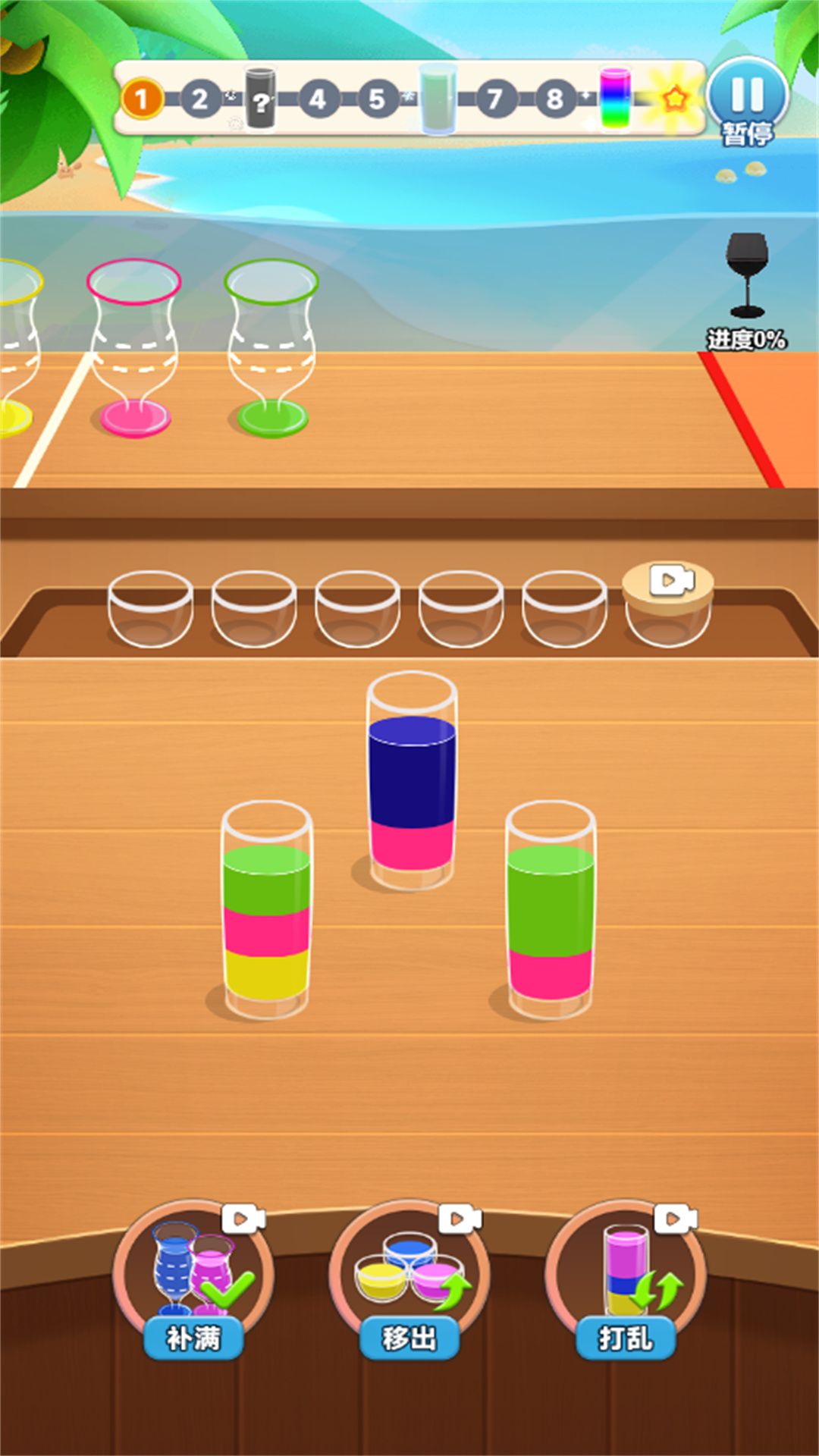 1、设计众多独特关卡,每关杯子数量与颜色组合各异,挑战逐步升级。
