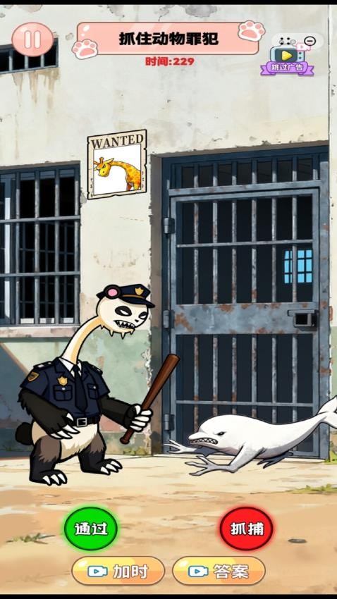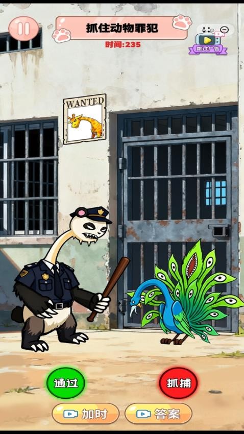 《最强脑力大挑战》是一款充满趣味的动物抓捕益智游戏,你将扮演动物警察,在监狱场景中根据“通缉令”线索,快速辨别长颈鹿、孔雀、白鲸等动物是否为罪犯。通过点击“通过”或“抓捕”按钮做出判断,在限时挑战中锻炼观察力,开启一场紧张又有趣的动物罪犯抓捕之旅。