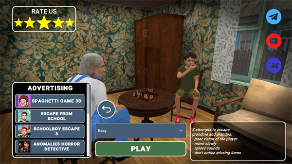 少年逃亡2(Schoolboy Escape 2)是一款策略解谜逃生游戏。玩家扮演被送往乡下与爷爷奶奶同住的少年,因厌倦繁重的家务,决心逃离村庄追寻自由。游戏中,玩家需在房屋与村庄间悄无声息地移动,利用阴影躲避爷爷奶奶及村民的监视,收集隐藏物品、破解谜题,还能利用材料制作工具开辟逃生路线。游戏采用3D第一人称视角,搭配紧张氛围音效,让玩家沉浸于逃亡的刺激感中。智能AI追捕者与多样解谜设计提升挑战性,每一次尝试都是脑力与胆量的较量。