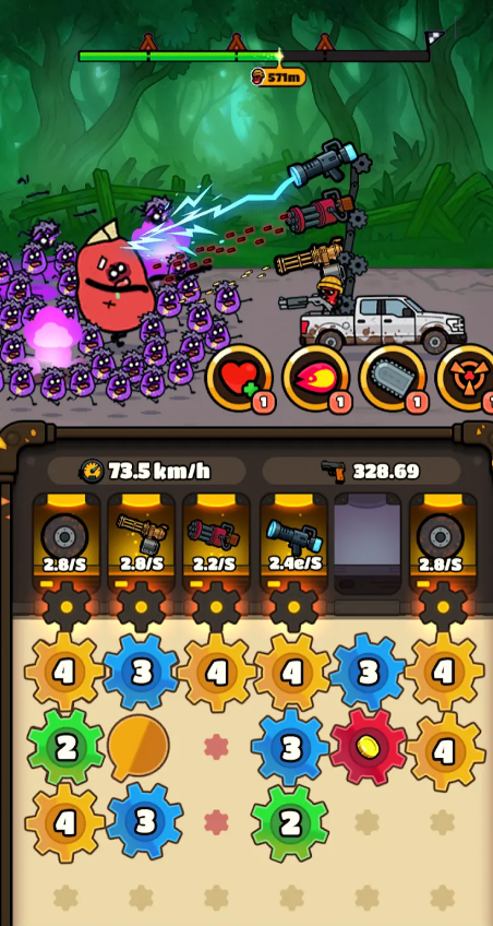 3、齿轮拼装与战斗准备:玩家在游戏开始后,收集攻击、防御、辅助等不同功能的齿轮,将它们安装在卡车指定位置,构建个性化战斗体系。战斗前需合理布局齿轮,提升火力、防御或解锁特殊技能,平衡输出与生存能力,为对抗僵尸做准备。