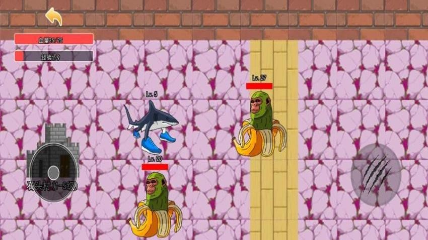 3、如图所示,这里是战斗界面,控制自己的角色靠近一个怪物就可以点击攻击按钮,需要攻击5个角色。
