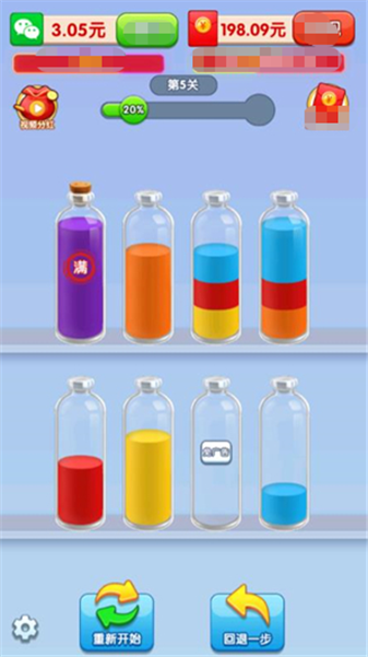 2、内置撤销上一步操作和提示功能,部分版本提供额外空瓶道具,帮助玩家摆脱卡关困境。
