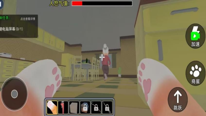 1、优先探索场景中的高互动区域,寻找能快速激怒主人的关键物品位置。