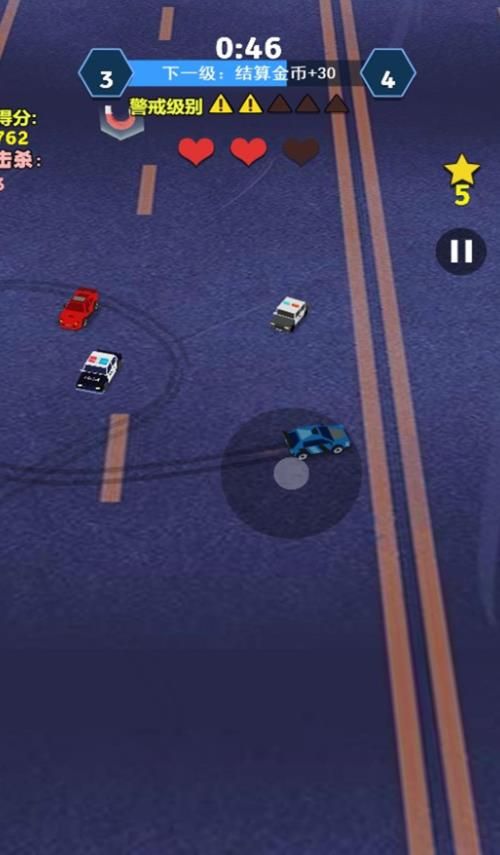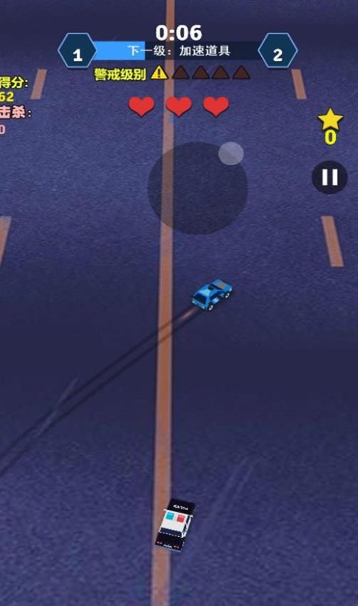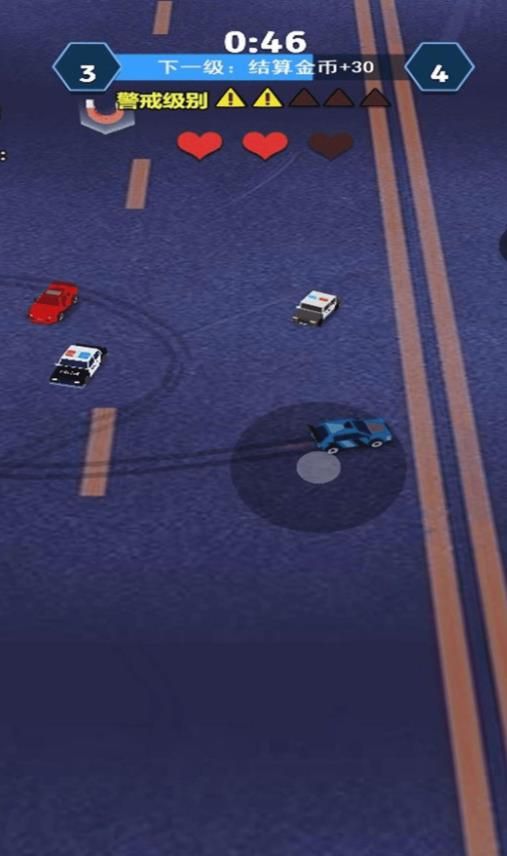 1、操控赛车在赛道上躲避障碍,收集金币与加速道具,完成 “警戒级别” 升级目标。