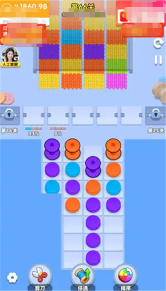 2、初始关卡颜色少布局简单,后续逐步增加颜色种类、缠绕复杂度、特殊毛线材质。