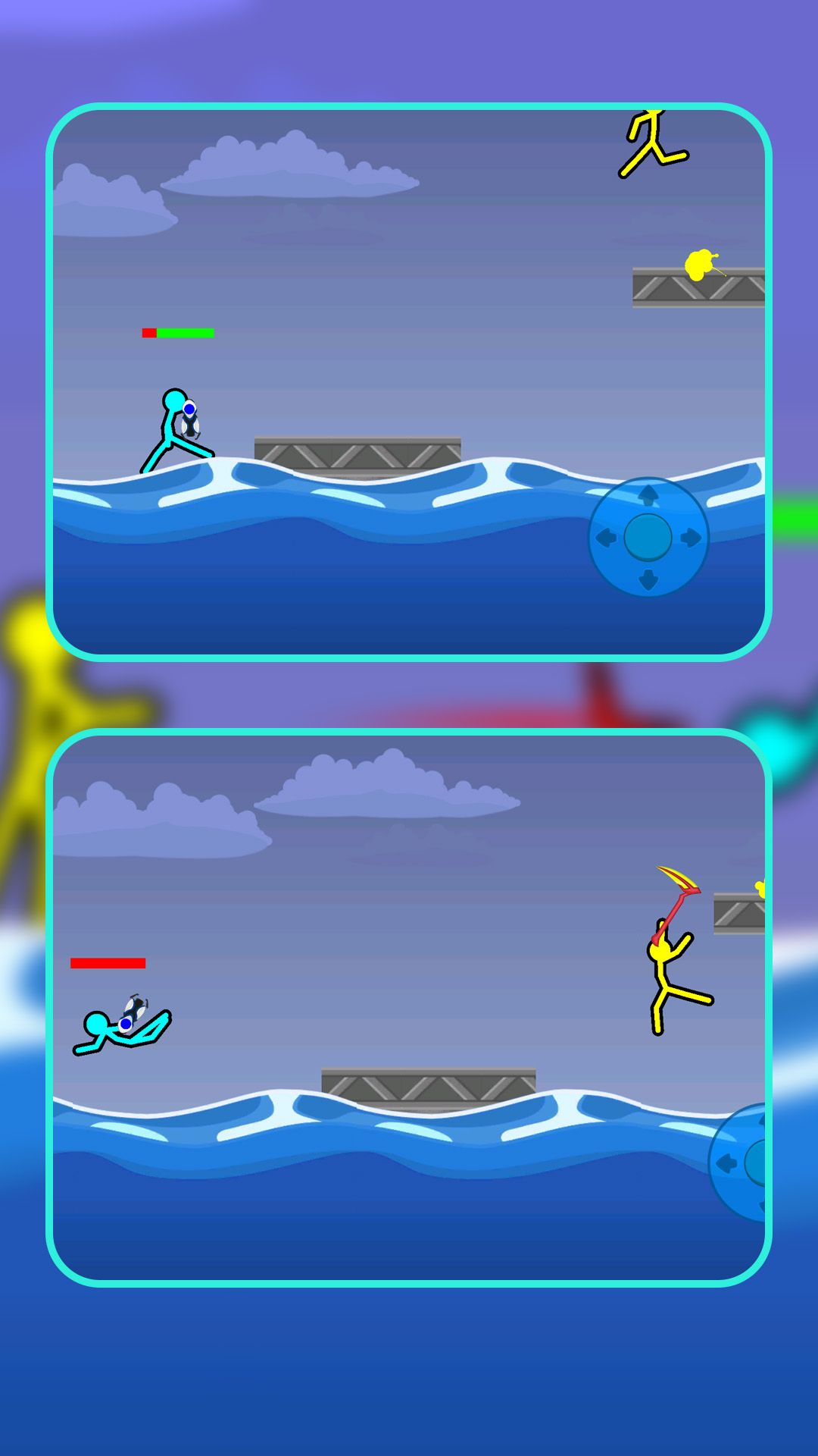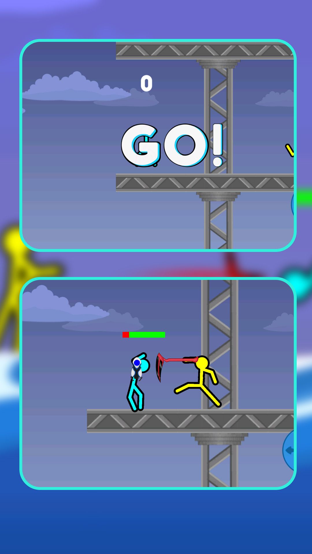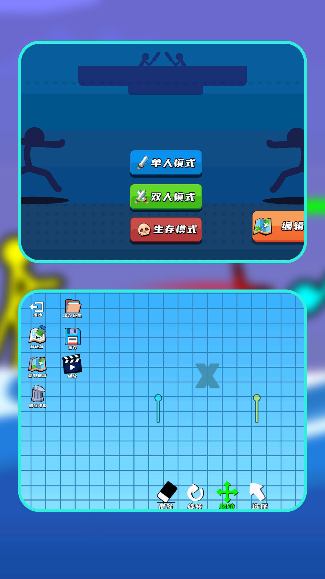 1、操控火柴人在不同地图场景中与敌方格斗,利用攻击、防御和特殊技能战胜对手。