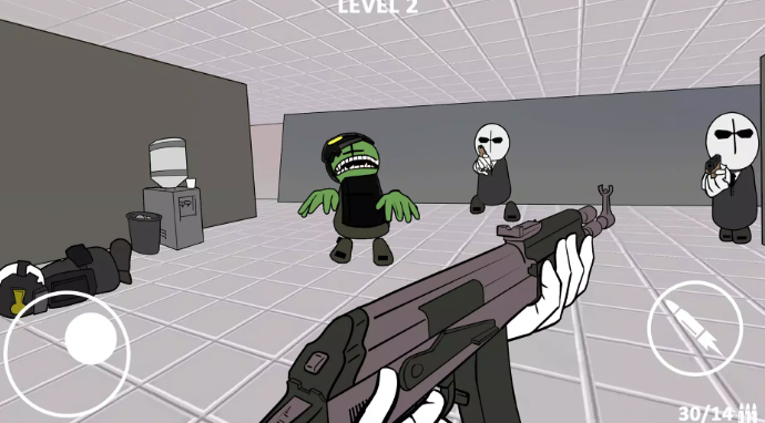 暴力迪吧射击是一款简单卡通的近距离射击游戏,玩家在游戏中将和一群人在一个房间中进行射击搏斗,玩家需要想办法和他们进行周旋,努力获得更多生存的机会,游戏画风简约卡通可爱,给玩家带来很多的有趣的视觉体验,增加玩家对游戏的坚持。优秀中有简单的搏斗也有武器强夺争取获得优势权。游戏总共五关,为玩家打造简短但十分刺激有趣的游戏体验,喜欢玩射击游戏的伙伴们可以从本站下载试试看呀。