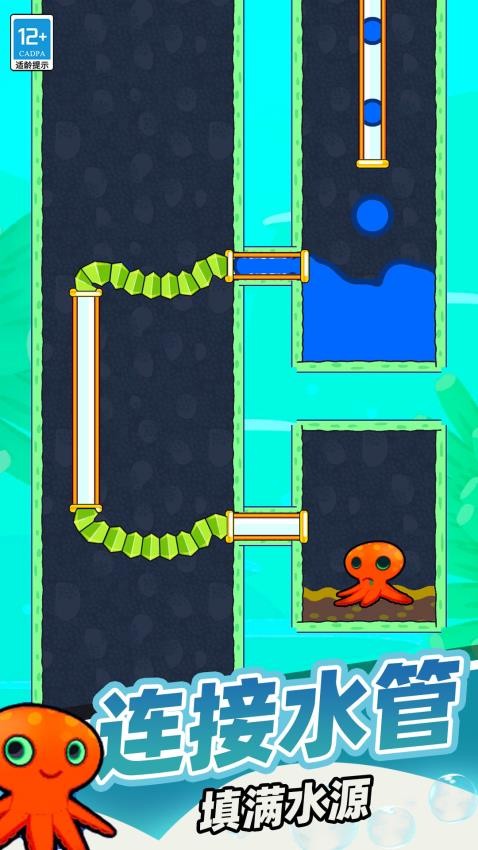 1、在关卡中你需找到最佳的连接方式,即可让海水流到八爪鱼所在的区域之中。