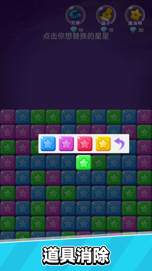 1、采用轻松的点触操作方式,只需选中两个及以上相邻的同色星星即可完成消除,无复杂指令要求,适合全年龄段玩家快速上手。