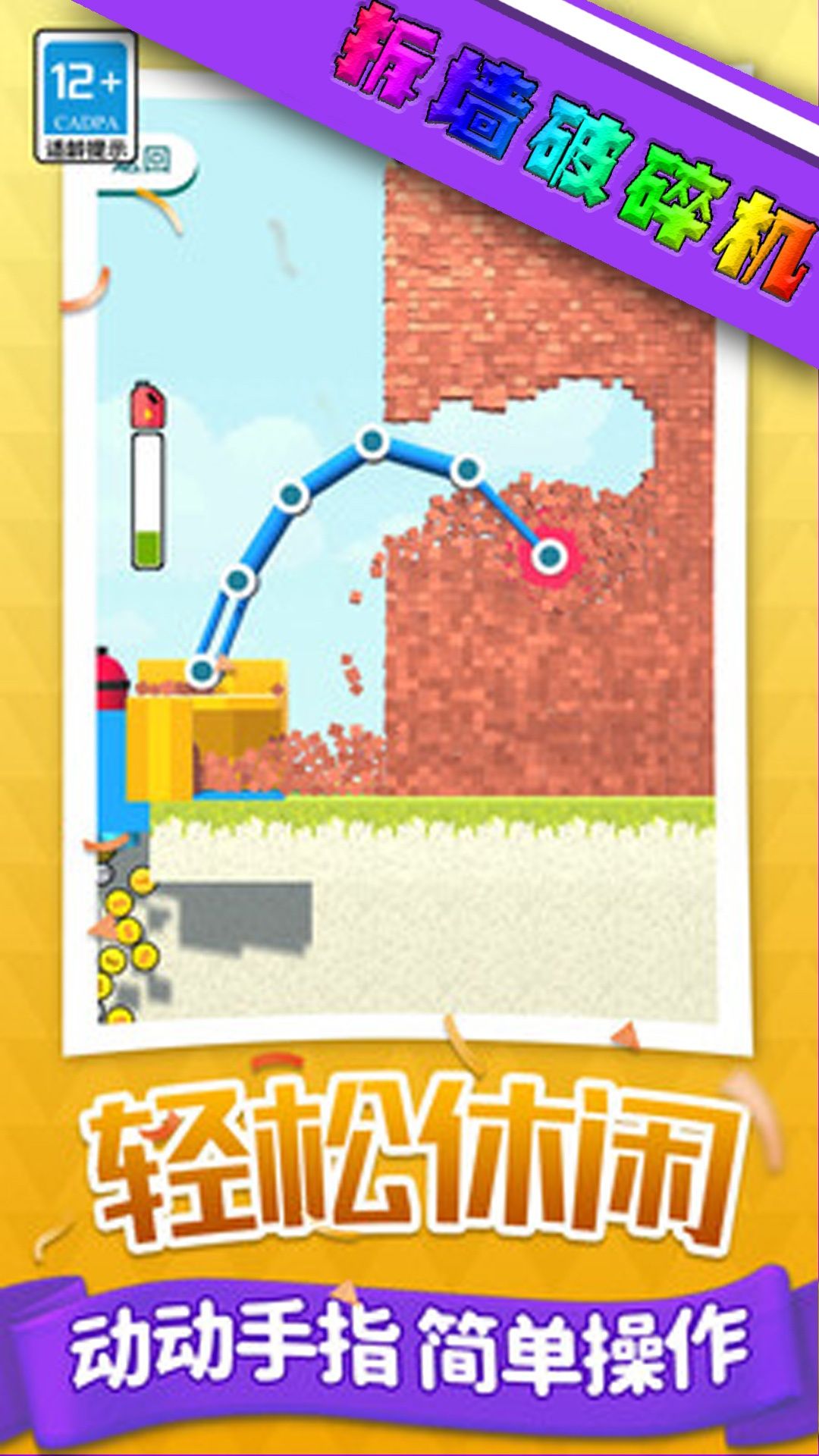2、资源收集与升级,通过破碎墙体收集砖块,兑换货币提升挖掘机性能。