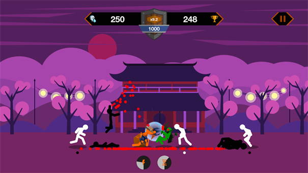 1.通过虚拟摇杆和按钮操控火柴人,使用拳击、腿踢、投掷等多种格斗技巧进行战斗。