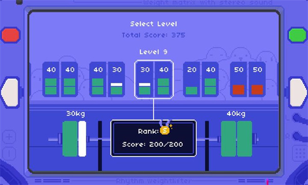 3.解锁并升级不同材质与属性的杠铃、杠铃片,影响手感、节奏容错率和表现分。
