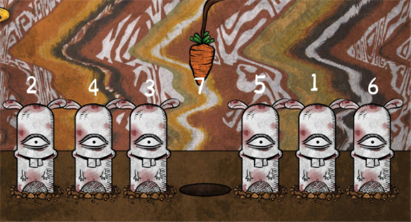 1、游戏【人生画廊】第三章关卡兔子骨头的过关方法是按照图中1-7的数字顺序点击洞口,会出现七只兔子,然后处在最中间的兔子会被胡萝卜所吸引,然后“咬勾”。