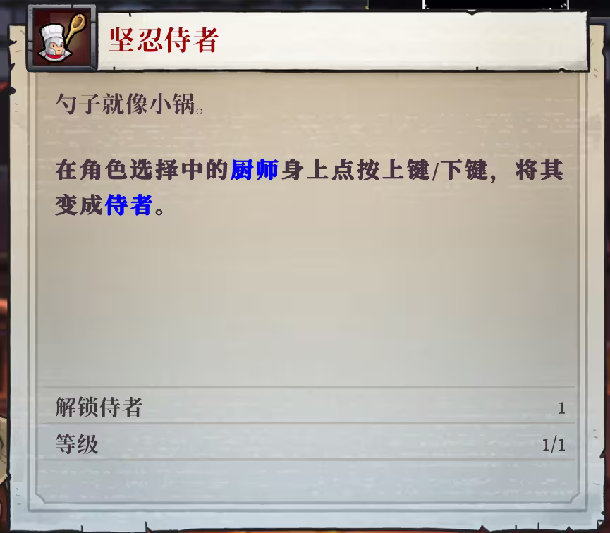 5、厨师进阶为坚韧侍者,武器为一袋勺子。发射后可弹跳一次,弹跳落地时造成暴击并附加智慧加成。虽支持瞄准与墙体反弹,但失去原版平底锅的弹幕反射能力,功能性大幅缩水,综合强度偏低。