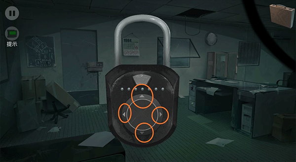 7. 在室内取得电池一块;在桌面发现密码纸条,据此解开挂锁。注意:挂锁密码输入方式为点击表盘边缘四点(对应钟表12、3、6、9点位),顺时针方向依次点击即可;上方按钮为无效操作,切勿误触。