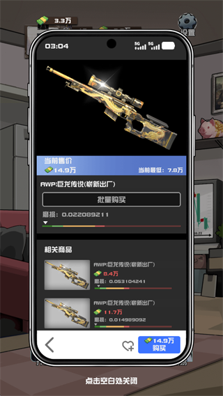 我在CS卖饰品是一款以CS饰品交易市场为背景的模拟经营手游,融合低买高卖、囤货套利、开箱炼金等经典玩法。玩家需在动态行情中精准判断价格走势,把握买卖时机,体验“饰品商人”的生存与翻盘。饰品价格实时波动,盲目跟风或决策失误可能导致资金链断裂。游戏界面简洁、操作直观,适配碎片化游玩,无复杂学习成本。