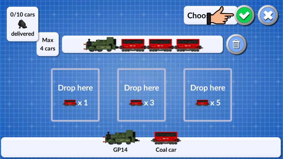7、路线设置完毕后,进入车厢编组界面:将煤车拖入任一下拉框中,至少添加一节煤车,再点击确定完成编组。
