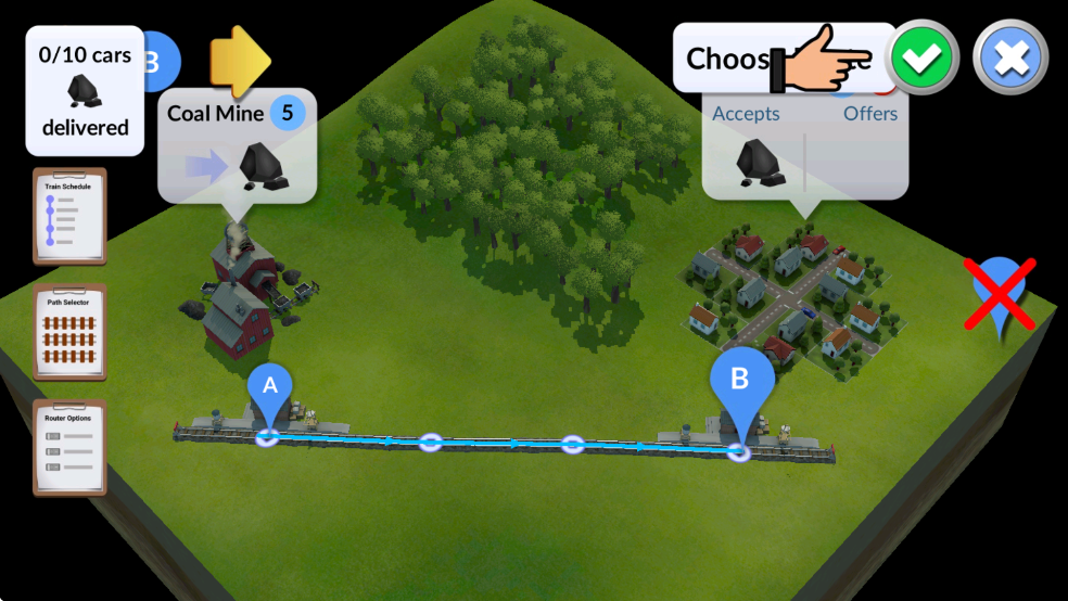 6、创建列车前需先设定运行路线:依次点击煤矿站与小镇站作为途经点,最后点击确认完成路线配置。
