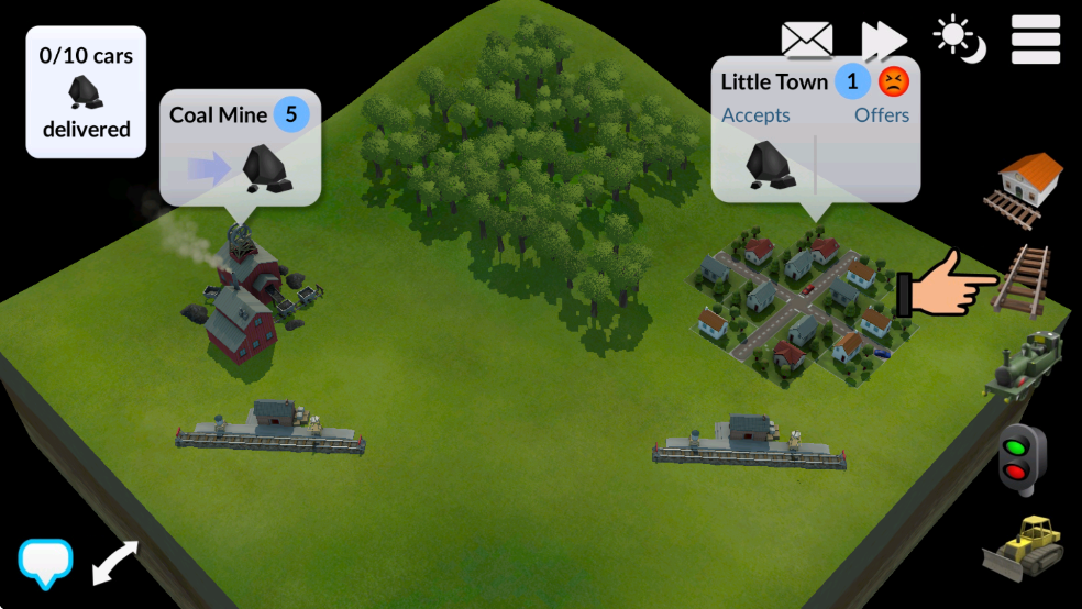 3、进入游戏后,你的首要目标是修建一条连接煤矿站与小镇站的铁路线,并成功运送10节车厢的煤炭。