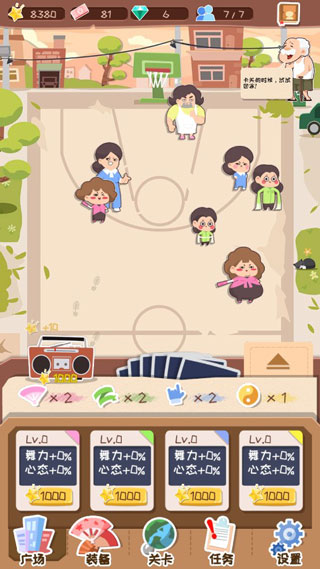 2、装备:包含广场规模、音响设备、家庭地位及钞票产出四大成长方向。所有装备升级均以钞票为资源,效果永久生效,不会因角色重置而回退。扩大广场可容纳更多大妈;提升音响与家庭地位,则直接强化战斗表现与资源收益。