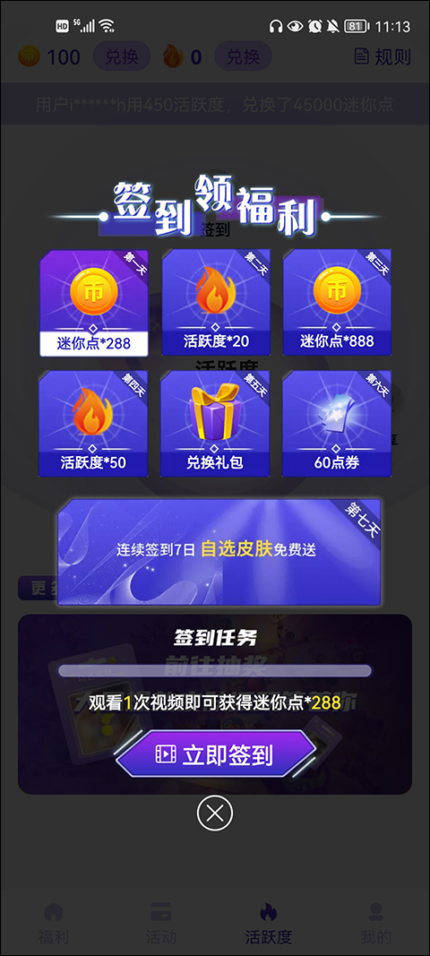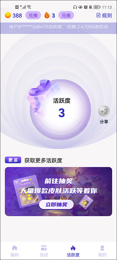 5、用户每天登录可提升活跃度,通过签到、抽奖或分享等方式持续积累活跃值,用于兑换爆款皮肤等高价值奖励;