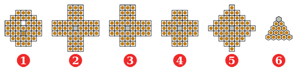 5、图中4号为标准英式孔明棋(即本作主玩法);1号为最常见变种——欧式孔明棋;6号等类型规则更为自由,甚至可用普通跳棋套装模拟体验。