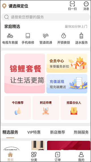 2、首页设置“家庭精选”快捷入口,并按类别细分服务类型,查找所需服务更直观高效;