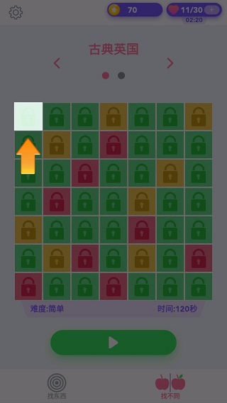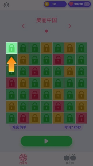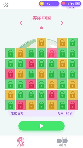 7、与单图模式一致,“找不同”关卡同样采用绿、黄、红三色区分难度,帮助玩家合理规划挑战路径。