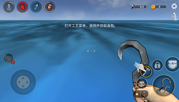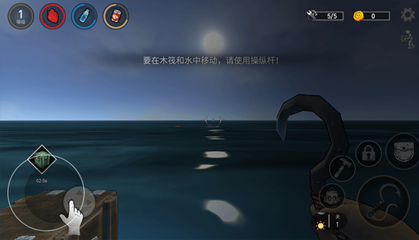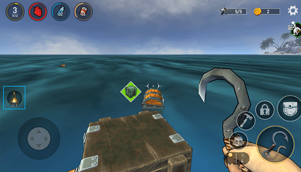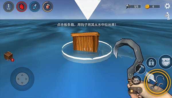 4、靠近水面漂浮物后,转动左侧摇杆对准目标,点击右侧“钩子”按钮即可将其拖拽至木筏边缘。