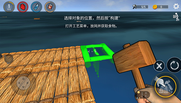 7、确认配方所需材料齐全后,选择木筏上合适位置,点击“构建”完成放置。
