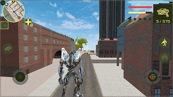 1、下载安装好钢铁机器人英雄手游,进入游戏后,右侧虚拟摇杆控制角色移动,左侧按钮负责射击与互动。