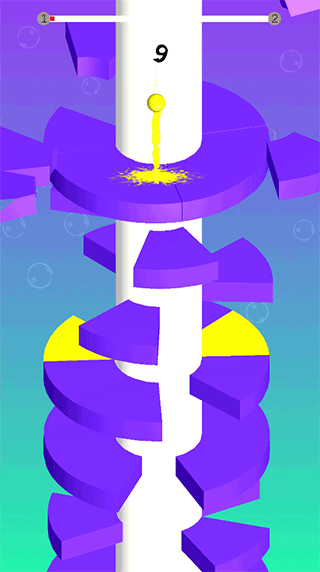 游戏中你需要持续转动环形塔结构,调整小球下落路径,使其以最佳角度精准击碎当前层级的板材,从而实现顺畅下落;