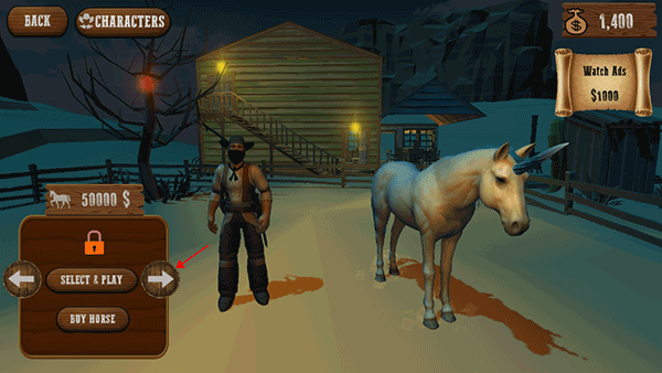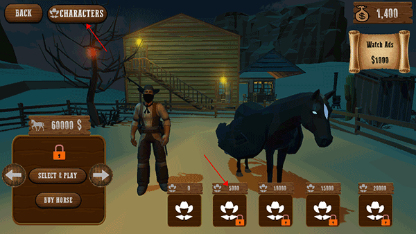 4、如需切换人物形象,点击界面顶部“CHARACTERS”,消耗金币解锁更多牛仔角色及专属套装;