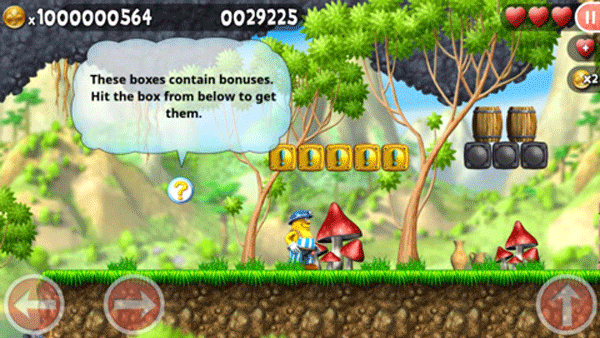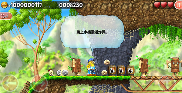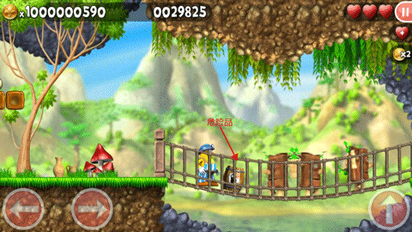1、左侧两个按键分别控制前进与后退,右侧为跳跃键,连续点击可触发二段跳;杰克初始拥有3颗爱心,触碰虫子等敌人会损失生命值。