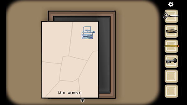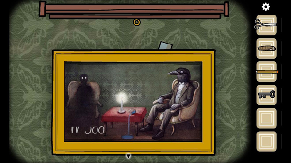 房间柜子上放置着一台复读机(用于播放磁带),旁边是打字机和一株植物。使用剪刀可剪下植物的叶子。门旁有电灯开关,打开后可在灯罩内部发现另一片照片碎片。